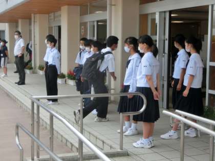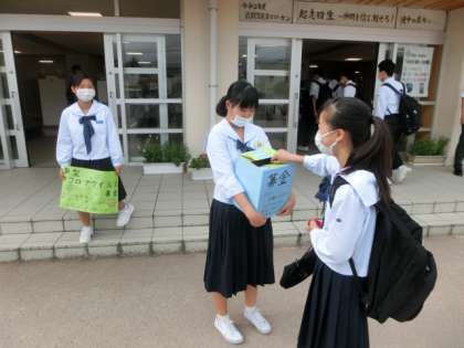 今週最後の登校。速中生は、今朝も元気に登校しました。玄関では、生活向上委員会の1年生が爽やかな挨拶で全校生徒を出迎えました。今朝も多くの生徒が、コロナ募金に協力してくれました。