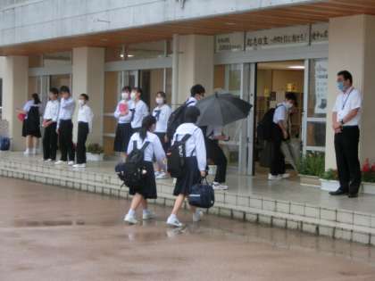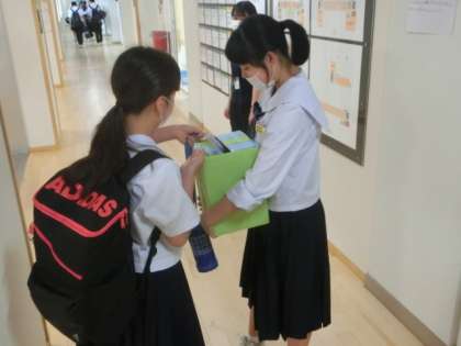 週の始まり。今朝も雨。玄関では、生活向上委員会の3年生が爽やかな挨拶で全校生徒を出迎えました。募金は、今日から「コロナが原因で飼い主を失ったペットへ」の募金に変わりました。