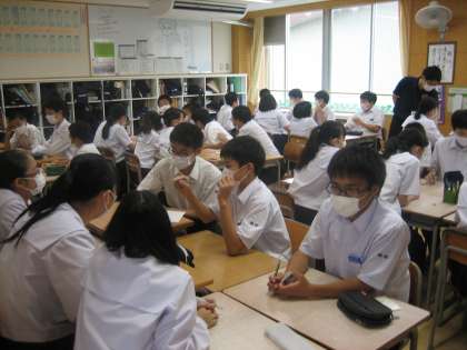 7月13日(月) 2年 学級活動 公開日 2020/07/13 更新日 2020/07/13 2年生 2年生は、各クラスで絆を深めるため、5限の学活でレクリエーションを行いました。 班ごとに別れて絵しりとりをしたり、担任と心が通じているか確認する簡単なゲームを行ったりしました。 みんな楽しそうに活動していました。きっと絆が深まったと思います。