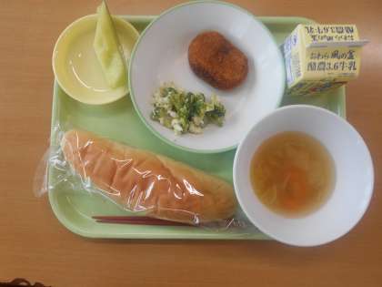 今日の給食は、牛乳・米粉コッペパン・白エビコロッケ・ブロッコリーサラダ・ひよこ豆のスプ・メロンでした。