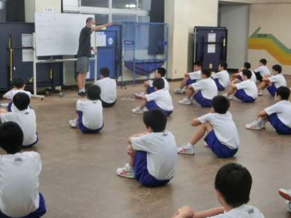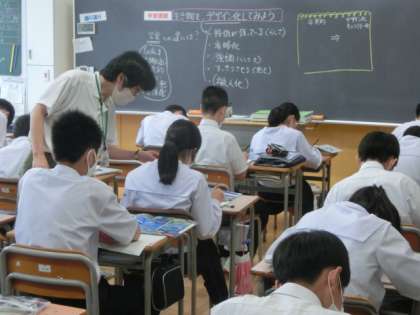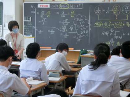 7月15日(水) 授業風景 公開日 2020/07/15 更新日 2020/07/15 全学年 上段は、1年男子の体育です。集団行動について学習しました。 中段は、2年の美術です。生き物をデザイン化しています。 下段は、3年の数学です。分母の有理化について学習しました。