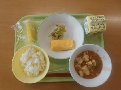 今日の給食は、ご飯・マーボー豆腐・卵ロール・チンゲンサイひたし・冷凍パインでした。