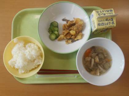 今日の給食は、ご飯・牛乳・高野豆腐のレバーのごまからめ・きゅうりもみ・茄子の味噌汁でした。