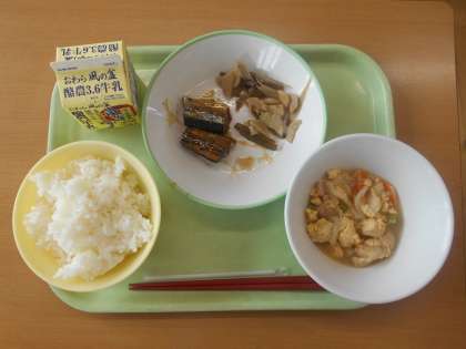 今日の給食は、ご飯・牛乳・さんまのマーマレード煮・茎わかめのきんぴら・卵とじでした。