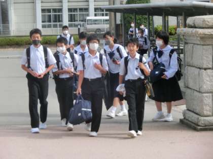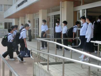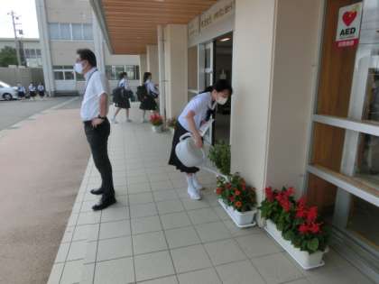 7月22日(水) 登校風景 公開日 2020/07/22 更新日 2020/07/22 全学年 明日からの傘マークが嘘のような晴天のもと、今朝も速中生は元気に登校しました。玄関では、生活向上委員会の1年生が爽やかな挨拶で全校生徒を出迎えました。ボランティア委員会の生徒は、花の水やりを行いました。