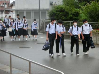 降っているのか分からないほどの霧雨で、やや涼しさも感じられる中、速中生は今朝も元気に登校しました。