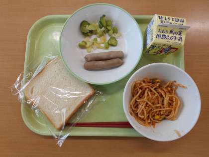今日の給食は、減量食パン・夏野菜スパゲッティ・ウインナー・枝豆サラダでした。