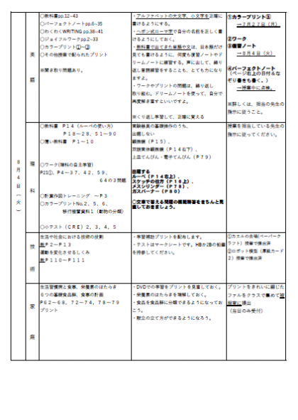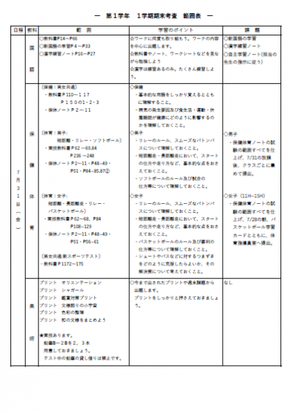 1年生の期末考査範囲表をアップしました。課題や提出期限等をご確認ください。