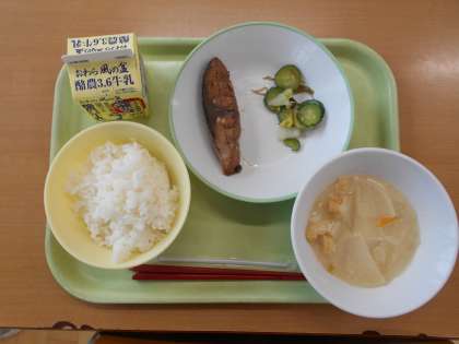 今日の給食は、ご飯・牛乳・ふくらぎ照り焼き・昆布あえ・呉汁でした。