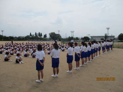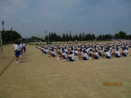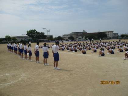 新型コロナ感染症対策としては、生徒は間隔を空けて活動を行いました。また、熱中症対策のため、水筒を持参したり、マスクをなるべく外すよう伝えたりしました。