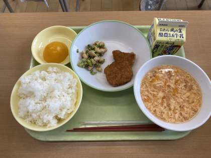 今日の給食は、ご飯・牛乳・お魚カツ・豆豆サラダ・レタスと卵のスープ・もも缶でした。