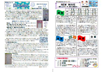 1学年だより第8号をアップしました。内容は、学年主任の巻頭言、本校卒業生の吉野美奈子さんの講演会に関する荒木教諭のコメント、第74回体育大会のスローガンの紹介、体育大会学年委員の発表および委員の決意表明、今後の行事予定です。
