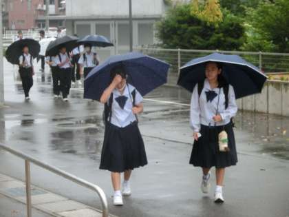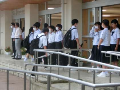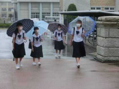 1学期最後の登校日は、雨。色取り取りの傘がアートな感じでした。玄関では、生活向上委員会の1年生が爽やかな挨拶で全校生徒を出迎えました。