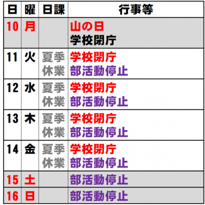 8月9日(日) 週予定