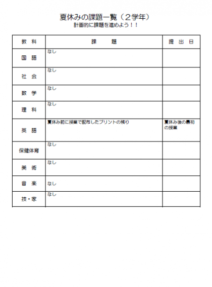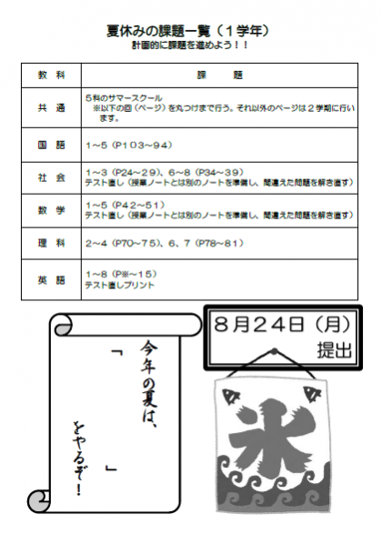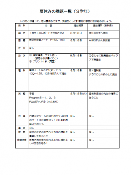 夏休みも佳境に入ってきました。短い夏休みということで、課題は例年に比べて大幅に少なくなっています。とは言うものの、そろそろ進捗状況が気になるところです。以下に、各学年の課題&提出日一覧をアップします。必要に応じて確認してください。