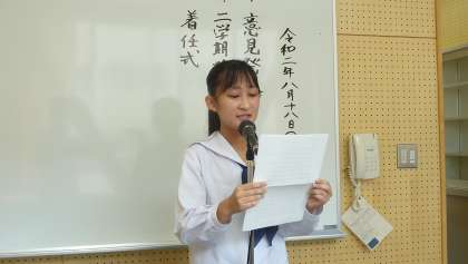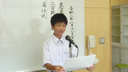 8月18日(火)の意見発表会では、以下の生徒が2学期に向けての決意や体育大会に向けての抱負を語りました。