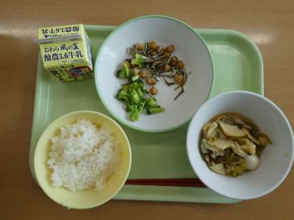 今日の給食は、ご飯・牛乳・八宝菜・小魚入りフライビーンズ・ゆでブロッコリーでした。