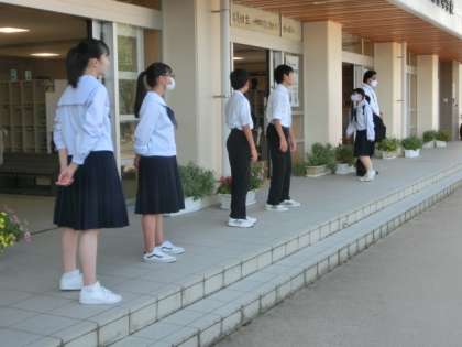 うだるような暑さの中、速中生は今朝も元気に登校しました。玄関では生活向上委員会の3年生が爽やかな挨拶で全校生徒を出迎えました。今日から、野球部が朝練を開始しました。
