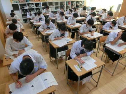 下段は、3年生です。学力確認テスト(社、国、理)を受けました。