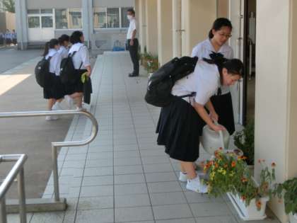 3年学力確認テスト2日目。友達同士で問題を出し合いながら登校する生徒の姿も見られました。ボランティア委員会の生徒は、花の水やりを行いました。