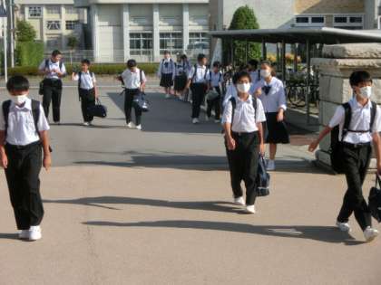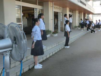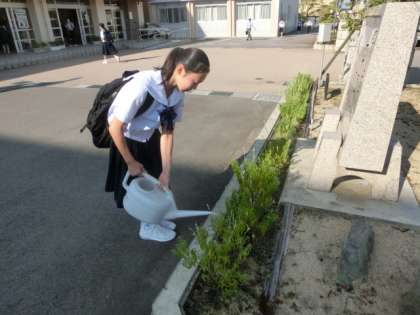 今朝も汗を振り絞りながら、速中生は元気に登校しました。玄関では、生活向上委員会の3年生が爽やかな挨拶で全校生徒を出迎えました。ミストシャワーも、フル稼働です。ボランティア委員会の生徒は、花の水やりを行いました。