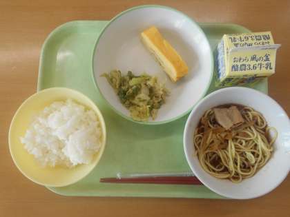 今日の給食は、ご飯・牛乳・ブラックラーメン・えごま入り卵焼き・グリーンアスパラのごまだれでした。