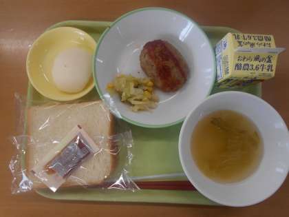 今日の給食は、食パン・牛乳・ハンバーグのマスタード煮・コーンサラダ・レタススープ・メープルシロップ・梨でした。