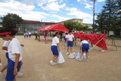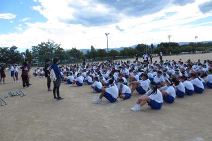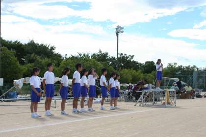今日の敵は、暑さよりも強風。舞い上がる砂埃にも負けず、予行練習を行いました。