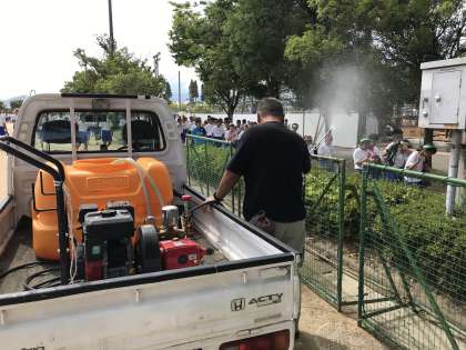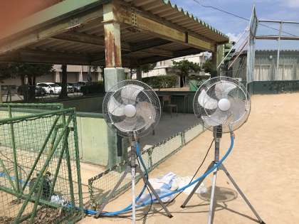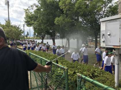 9月4日(金) 体育大会の準備 熱中症予防(ミストファン、ミスト) 公開日 2020/09/04 更新日 2020/09/04 体育大会 9月4日(金)、体育大会の熱中症予防として、救護場所近くに2台のミストファン、通路に散水機ミストを設置し、試験的に稼働してみました。 どちらも水道水を利用しており、生徒が涼を取れるように工夫しています。