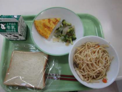 今日の給食は、減量食パン・こんにゃくサラダ・スパニッシュオムレツ・キノコとツナのスパゲッティーでした。