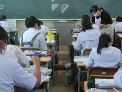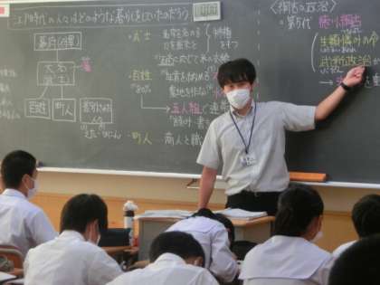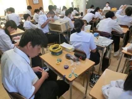 9月10日(木) 授業風景 公開日 2020/09/10 更新日 2020/09/10 全学年 上段は、1年の美術です。モダンテクニックを用いて描画しています。 中段は、2年の社会です。江戸時代の人々のくらしについて学習しました。 下段は、3年の家庭科です。子どものための玩具を製作しています。