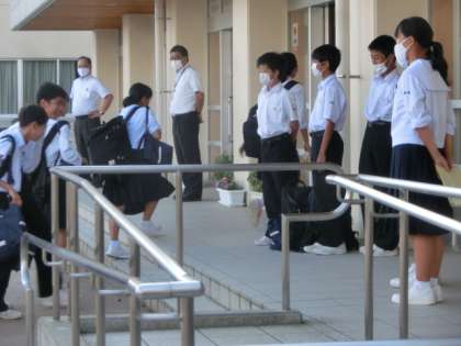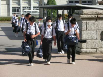 9月14日(月) 登校風景 公開日 2020/09/14 更新日 2020/09/14 全学年 すっかり秋めいてきたことを感じさせる中、生徒たちは元気に登校しました。玄関では、生活向上委員会の1年生が爽やかな挨拶で全校生徒を出迎えました。