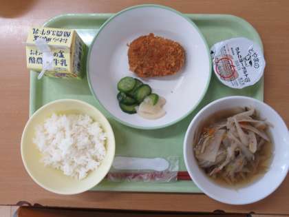 今日の給食は、ご飯・牛乳・豆とカボチャのコロッケ・かぶの色どり・根菜汁・りんごヨーグルトでした。