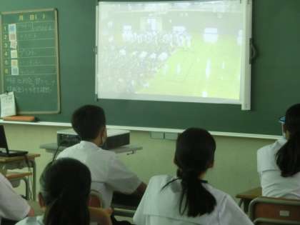 下段:体育館の様子を各教室にて視聴しました。