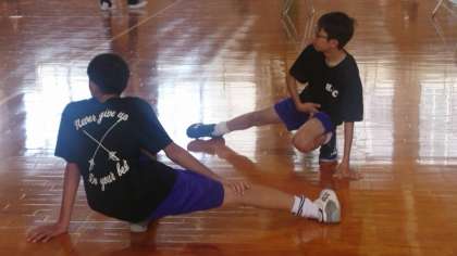 速中フェンシング部からは、東くん(2)、石川くん(2)が出場します。ただいまウォーミングアップ中です。