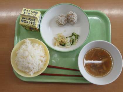 今日の給食は、ご飯、牛乳、チンズワンズ、茎わかめのスープ、あわせ和えでした。