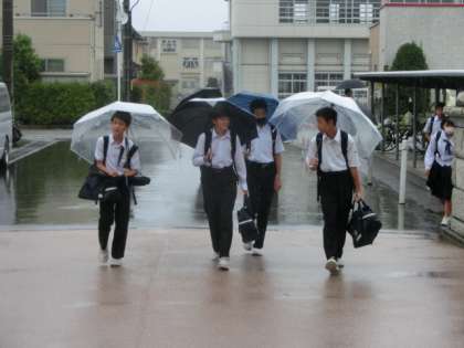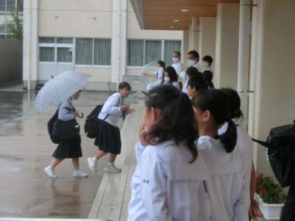 久しぶりの雨でしたが、生徒たちは元気に登校しました。色取り取りの傘が、素敵なアートを織り成していました。