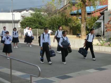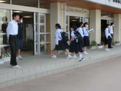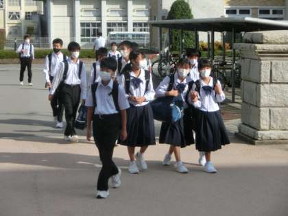 9月最終日の朝も、速中生は元気に登校しました。玄関では、生活向上委員会の3年生が爽やかな挨拶で全校生徒を出迎えました。