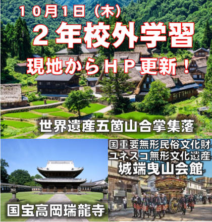 10月1日(木)、2年生は「五箇山合掌集落」「高岡瑞龍寺」「城端曳山会館」に出発します。