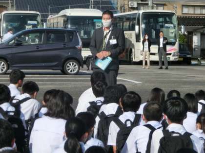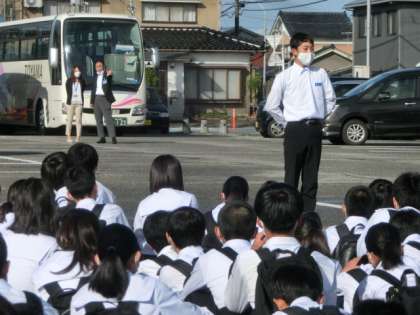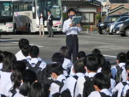 8時過ぎ、2年生は時間通りに速星公民館横駐車場に集合し、出発式を行いました。