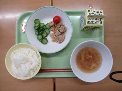 今日の給食は、ご飯・ミニトマト・豚キムチ・チーズ・きゅうりもみ・沢煮椀でした。