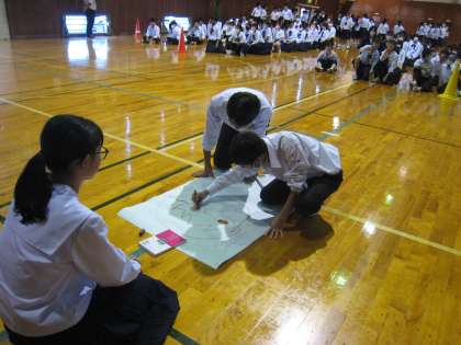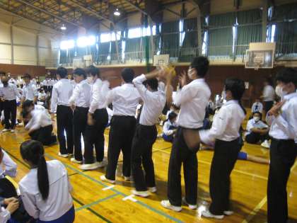 3年生は、6限に学年生徒会が中心となり体育館でレクリエーションを行いました。3年生の生徒の誰が歌っているかを答えるイントロクイズをしたり、一筆書きリレーで学年主任の顔を書いたり、団対抗でボールリレーをしたりと、終始笑顔の絶えない楽しいひとときを過ごしました。