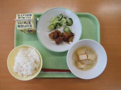 今日の給食は、ご飯・牛乳・ぶりの照り煮・きざみあえ・具だくさん汁でした。