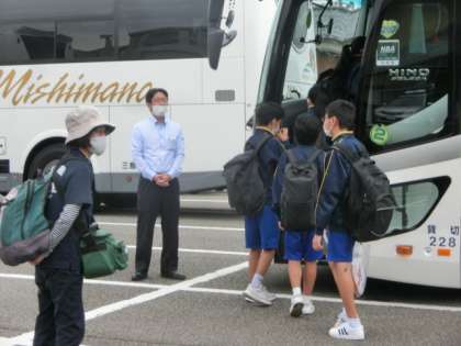 教室で出欠確認、健康観察を行った後、婦中ふれあい館駐車場に移動して、バスに乗車しました。