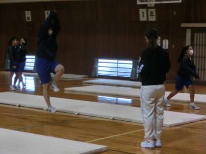 中段は、2年女子の体育です。走り幅跳びの空中動作について学習しました。