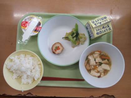 今日の給食は、ご飯・牛乳・海老と豆腐のうま煮・野菜の肉巻き・おひたし・カスタードプリンでした。