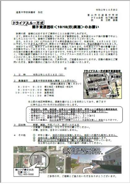 年度当初、10月18日(日)に予定していたPTAバザーが、新型コロナ感染症予防の観点から、中止となりましたが、以下の通り【ドライブスルー方式】の資源回収を実施することになりました。