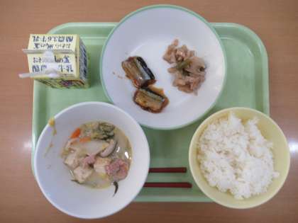 今日の給食は、ご飯・牛乳・ゴマ豆乳鍋・秋刀魚(さんま)のマーマレード煮・レンコンのきんぴらでした。