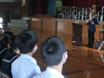 3年生は、生徒・保護者を対象に私立高校の説明会を行いました。5つの私立高校の校長先生や教頭先生が、コースや卒業後の進路についてスライドや映像を交えて詳しく説明していただきました。