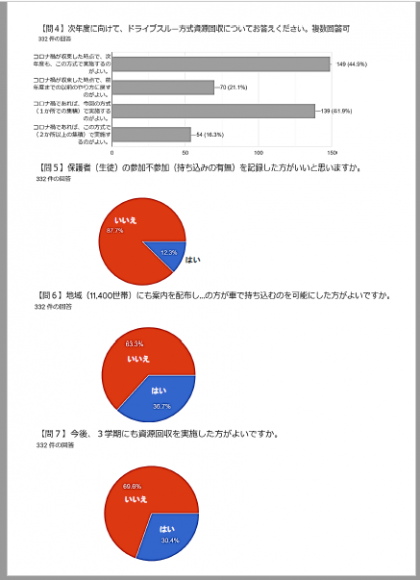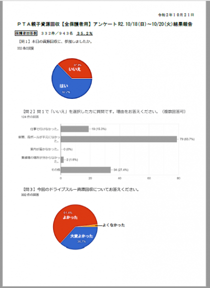 つきましては、10/18(日)〜10/20(火)の期間にご協力いただいた、PTA親子資源回収についてのオンラインアンケートの集計を報告いたします。